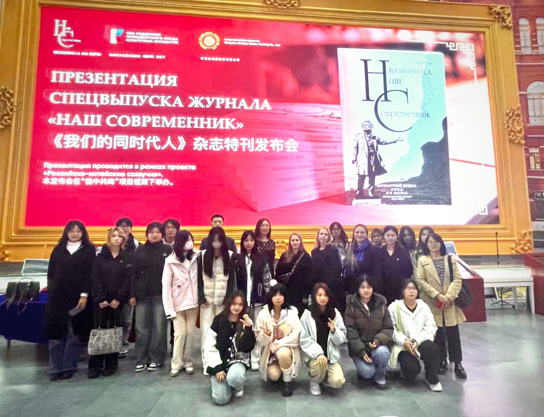俄语系蒋春丽老师和20名本科和研究生学生受邀参加在青岛上合之珠国际博览中心举办的俄罗斯诗歌杂志《我们的同时代人》首期中俄双语特刊发布会,与现场中外诗人一起共同体验感受俄语诗歌的独特美感。