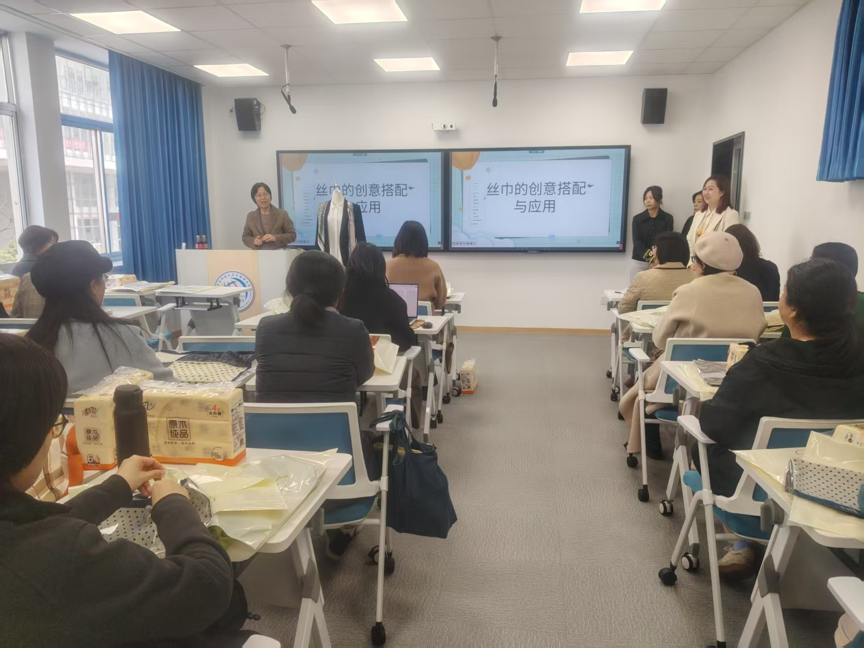随后,陈晶女士以专业视角展开分享,她结合自身作为文化部认证色彩搭配师、日本COLOR TOP 形象顾问及意大利 MKS 时尚学院认证顾问的丰富经验,从色彩理论、风格定位入手,细致讲解了不同材质、花色丝巾与肤色、服饰的适配技巧。在实操演示环节,陈老师现场示范了法式结、蝴蝶结、披肩式等多种经典丝巾系法,一边操作一边拆解步骤,还邀请教师代表上台互动,手把手指导调整细节,让抽象的美学知识变得直观易懂。台下老师们也纷纷拿出院妇委会精心准备的丝巾,跟着老师同步练习,认真记录要点,在轻松愉悦的氛围中感受着方寸丝巾的百变魅力。